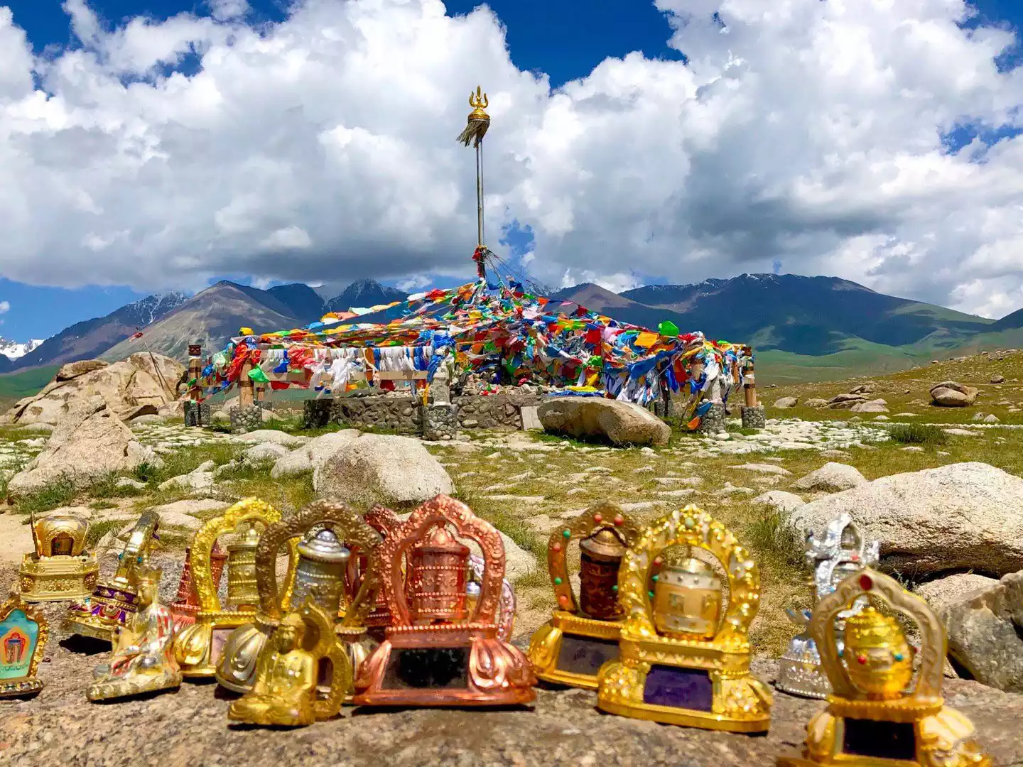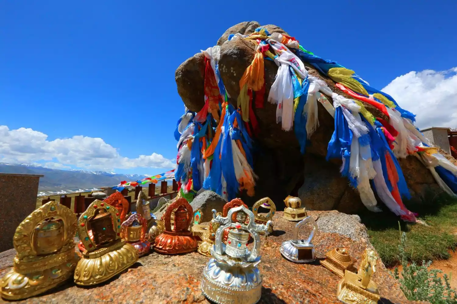 Many offerings are placed in the cracks of the stone, and there are three prayer wheels around it. The Spring Festival and the Medal Festival are the busiest times around the "Mother Stone", when herders from far and near bring their families and sheep to worship.