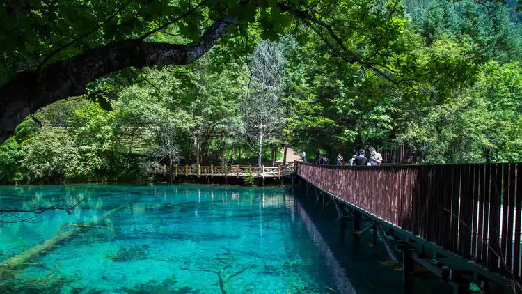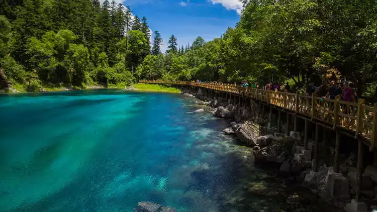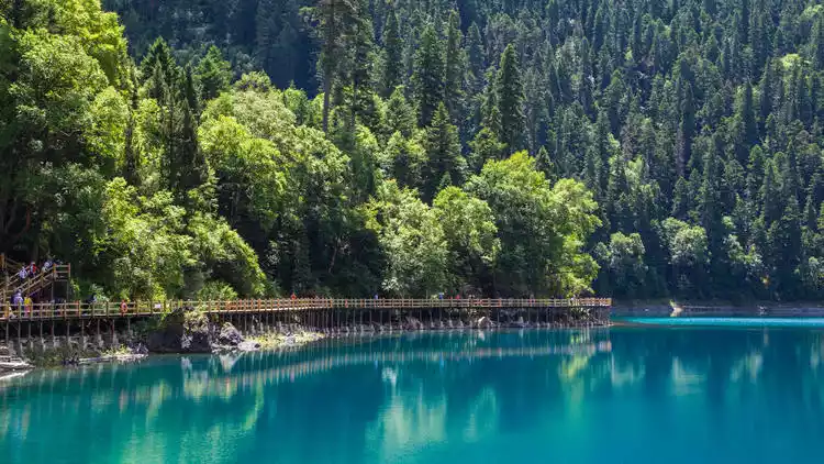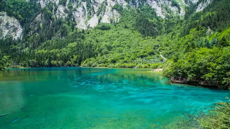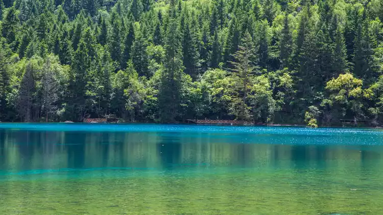 One kilometer down from Changhai is the Five-Colored Pool, which is 2,995 meters above sea level and 6.6 meters deep. Although the Five-Colored Pool is the smallest among the lakes in Jiuzhaigou, its colors are the most colorful, comparable to Wuhua Lake.
