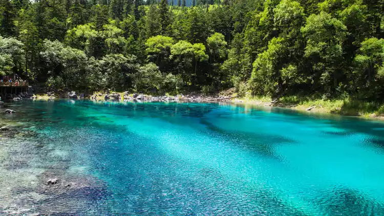 The Five-Colored Pool is exceptionally clear, revealing the stone patterns on the rock surface beneath. The contrasting colors of the sediments and the surrounding plants give the originally azure surface a multicolored hue. It is the quintessence of Jiuzhaigou's lakes and its most exquisite, earning it the nickname "The Eye of Jiuzhaigou."