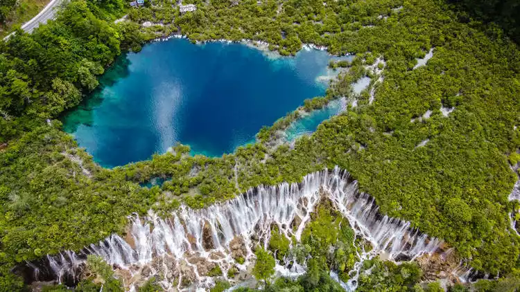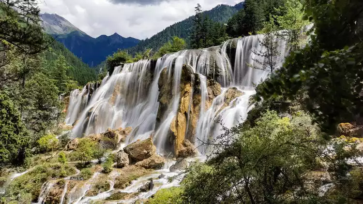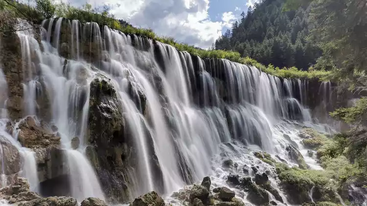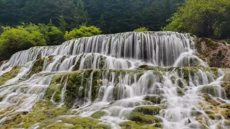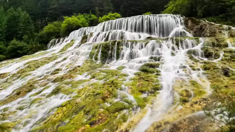 The Pearl Beach Waterfall is 2,445 meters above sea level. The waterfall is 21 meters high and 162 meters wide. It is a typical composite landscape in Jiuzhaigou. It is the place where Tang Monk and his disciples waded through water on horseback in the opening of the TV series "Journey to the West".