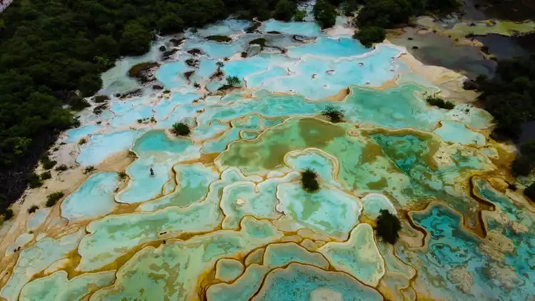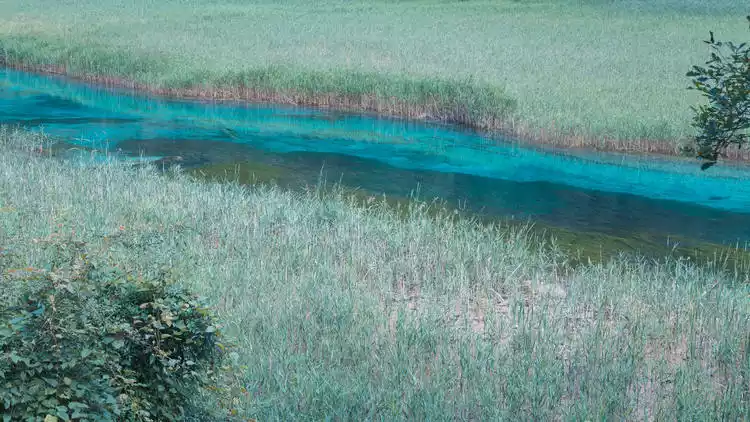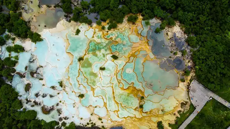 The banks of the Five-Colored Pool are low and staggered, and the water overflows. From a distance, the colorful pools look like pieces of emerald jade plates. Under the sunlight, they are white, purple, blue, and green in different shades, colorful and extremely beautiful.