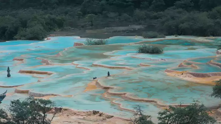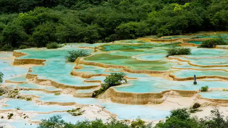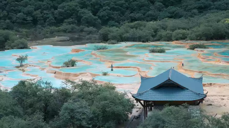 The Huanglong Scenic Area is famous both at home and abroad for its rare karst landforms, with its main scenery being the large-scale, ingeniously structured and colorful surface travertine landscape. It can be called a fairyland on earth.