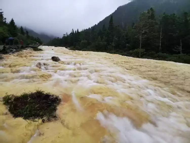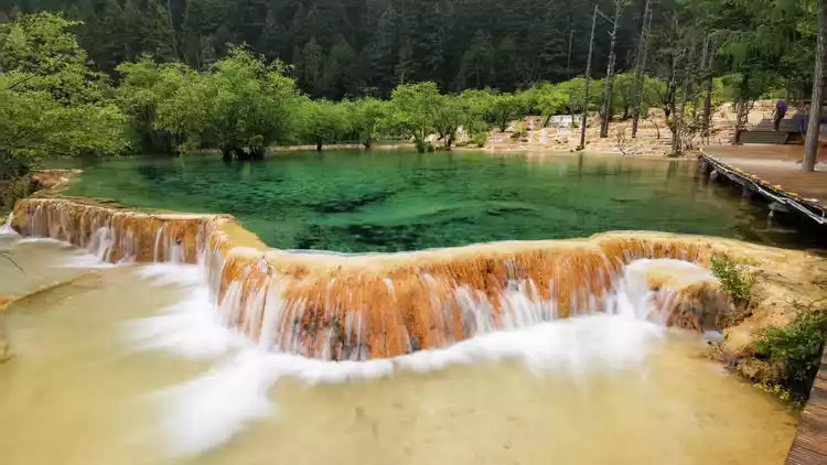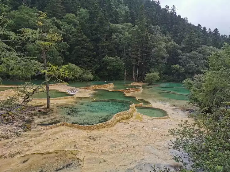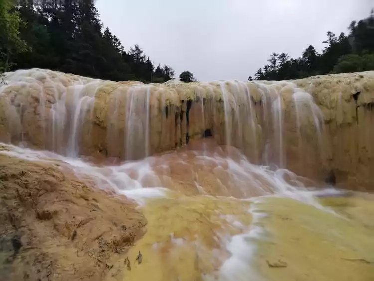 Because the carbonate here has lost the geographical conditions for solidification into pools, the waves spread over a ridge-like slope about 1.3 km long, and condensed into layers of golden travertine beaches on the bottom of the water, like pieces of "scales", gleaming golden light under the sunlight, which is another rare wonder of Huanglong.