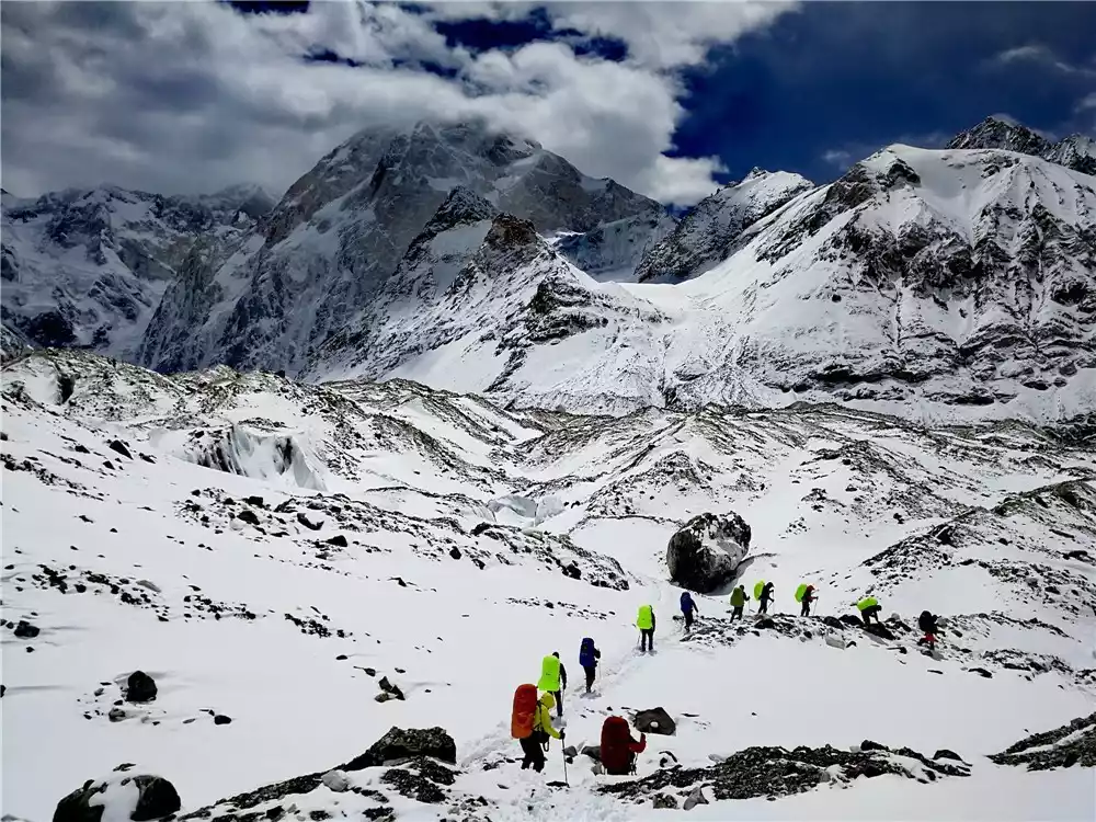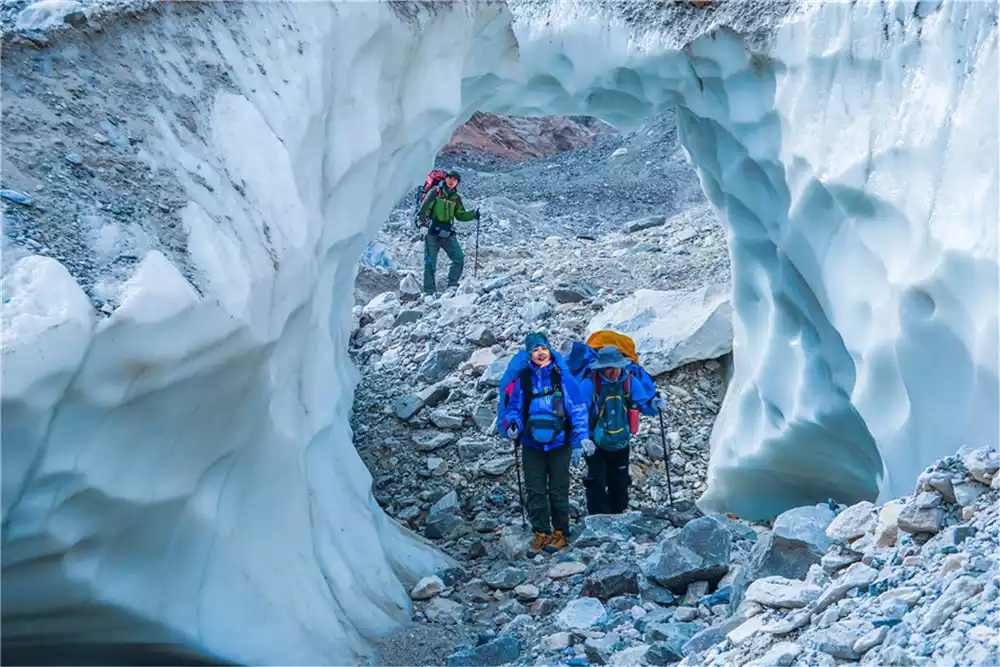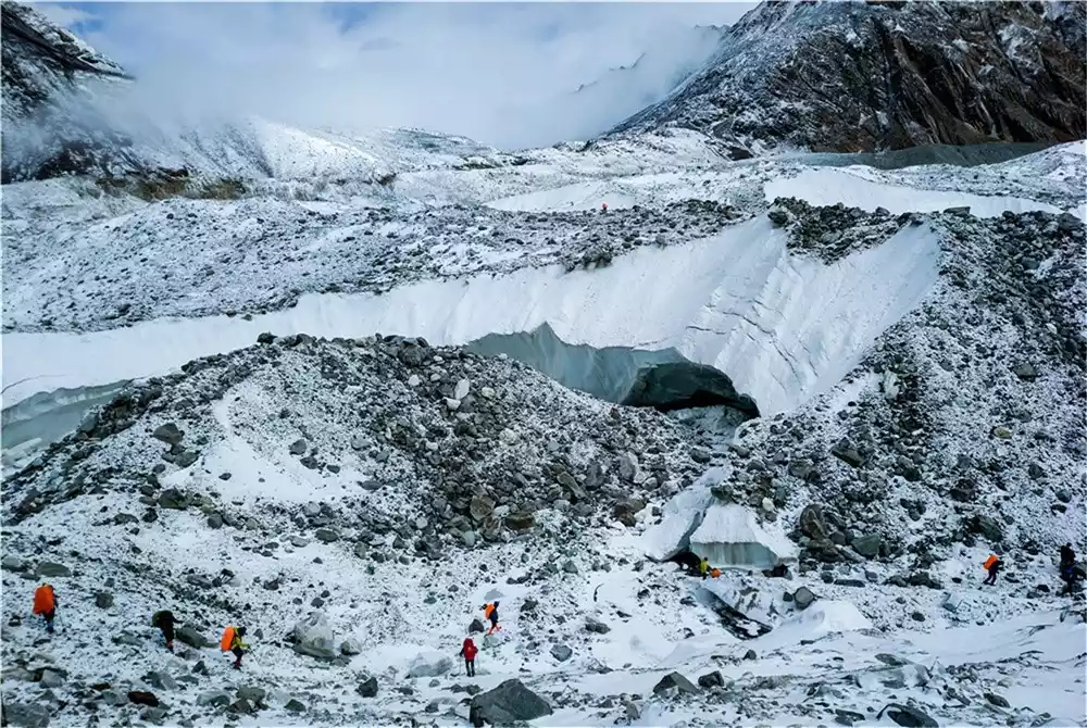 1. The glacier has a dramatic drop, with some areas almost 100 meters vertical. The glacier is crisscrossed with crevasses, and the depths are unseen. When descending the glacier, it's important to have strong and skilled team members repeatedly explore the route to find a relatively safe route.