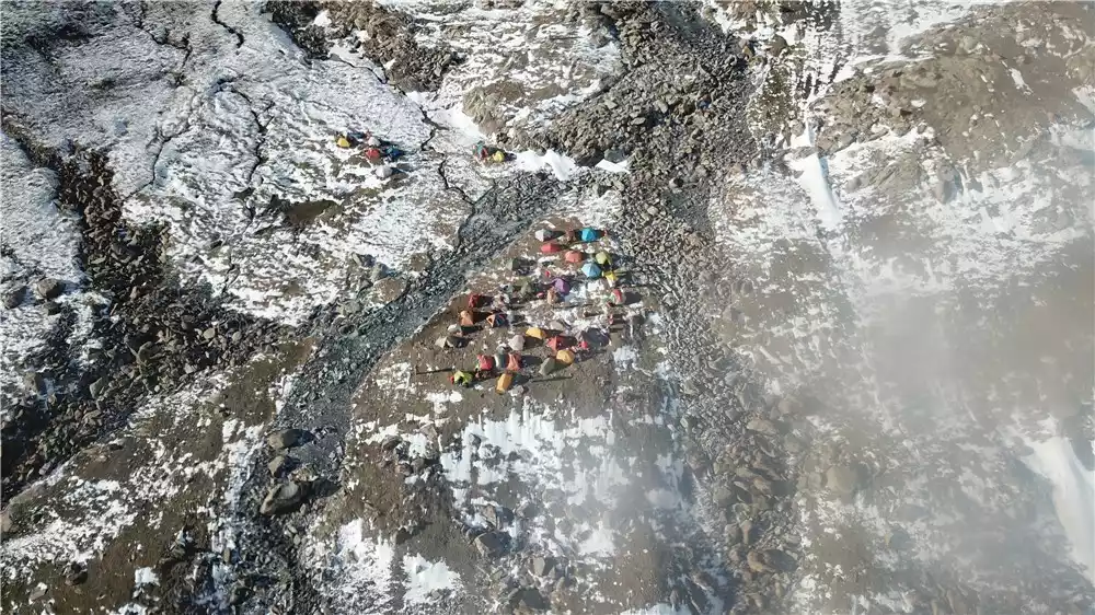 Don’t rush down the glacier that night. Instead, camp in the ancient barracks beside the ancient trail at the end of the glacier (there are many ruins of ancient barracks, the west walls of the houses are still preserved, but the roofs are gone, and tents can be set up inside the houses).