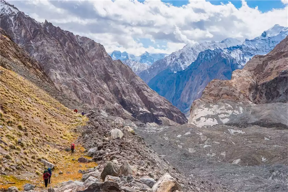 About 20 kilometers after leaving the Mumzart Glacier, the river valley widens. In summer, the ice and snow melt, and the nearly 800-meter-wide riverbed is flooded. On the east bank, a steep cliff over 100 meters long and nearly 150 meters high flows through it, interrupting the ancient trail. To cross, you must climb over the cliff; never wade!