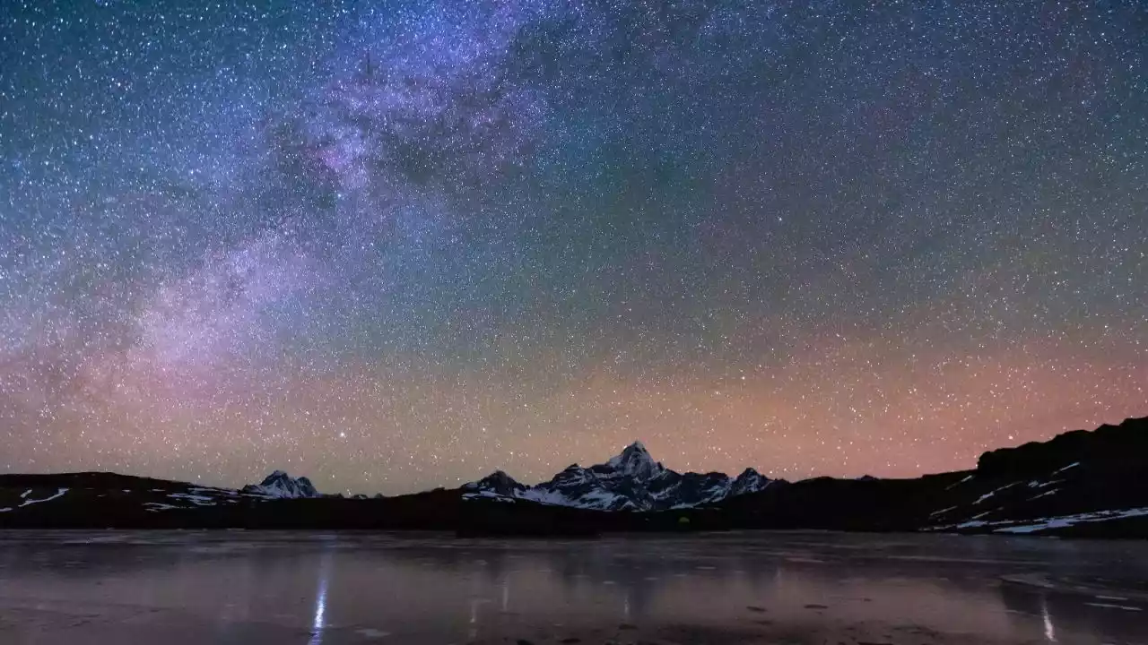 Camping in the Starry Sky Camp, the sky is extremely clear, dotted with stars, there is no wind, and the lake is like a mirror. At dusk, the sun shines on the golden mountain, and at sunrise, the light fills the lake.