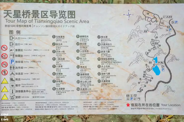 After getting off the cable car, there will be an electric car to take you to the starting point of the second half, from where you can walk back to the entrance of Tianxing Bridge and change to a shuttle bus to Doupotang.