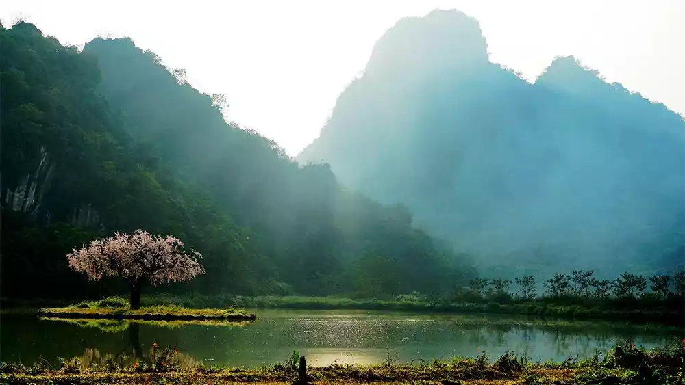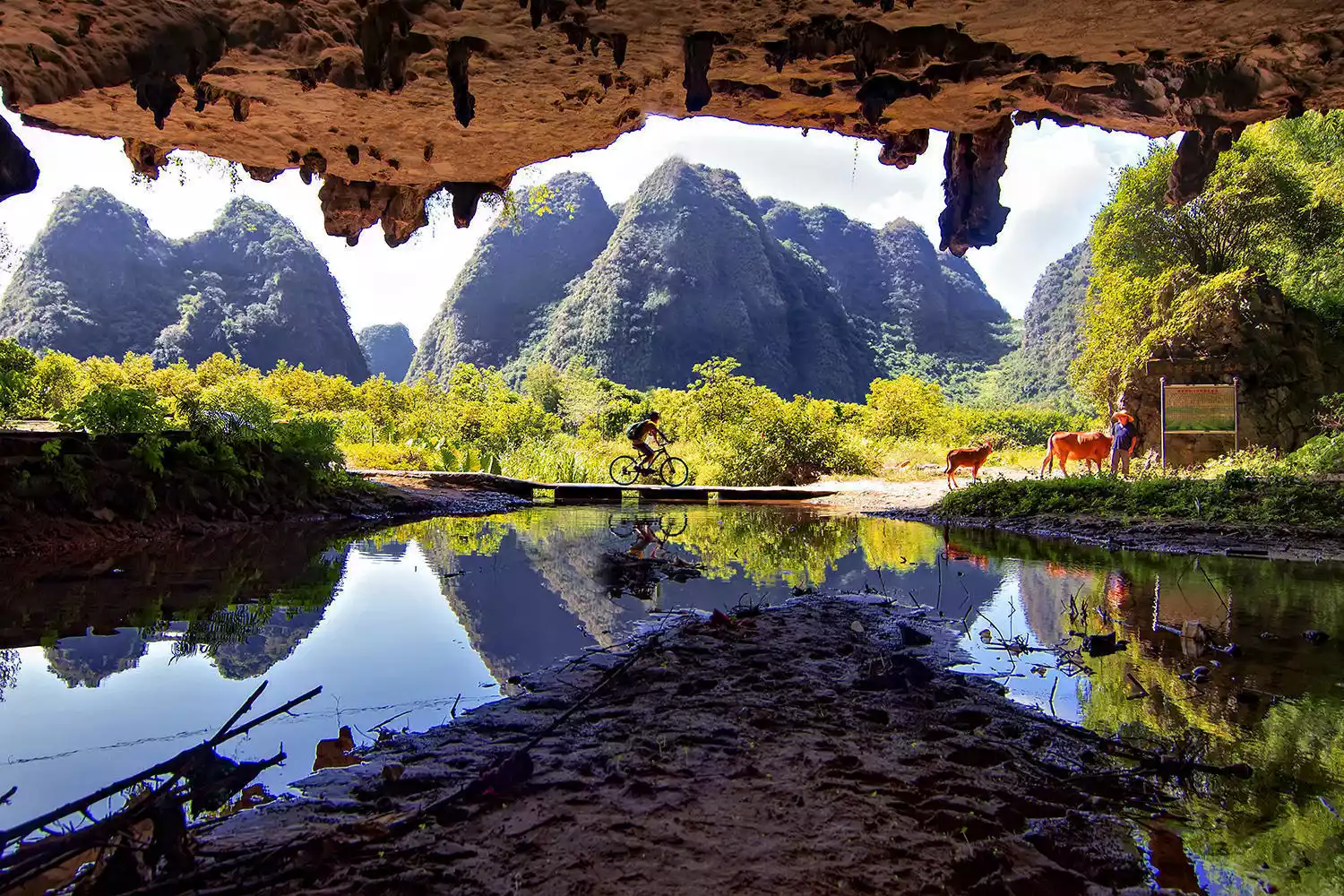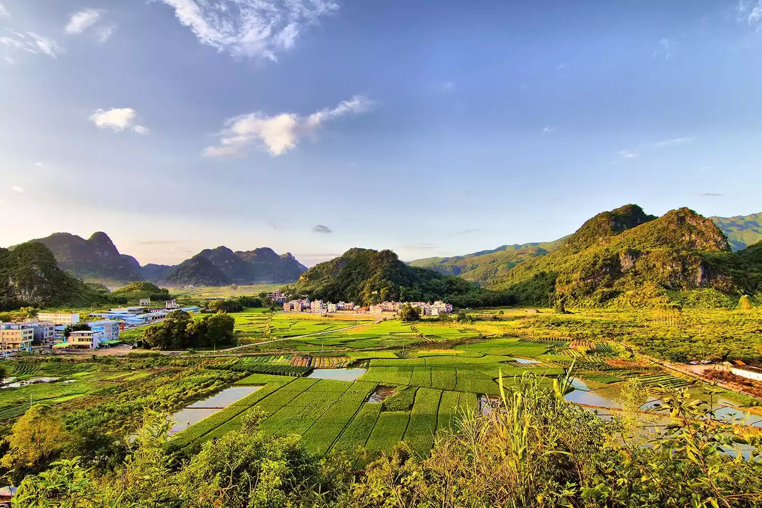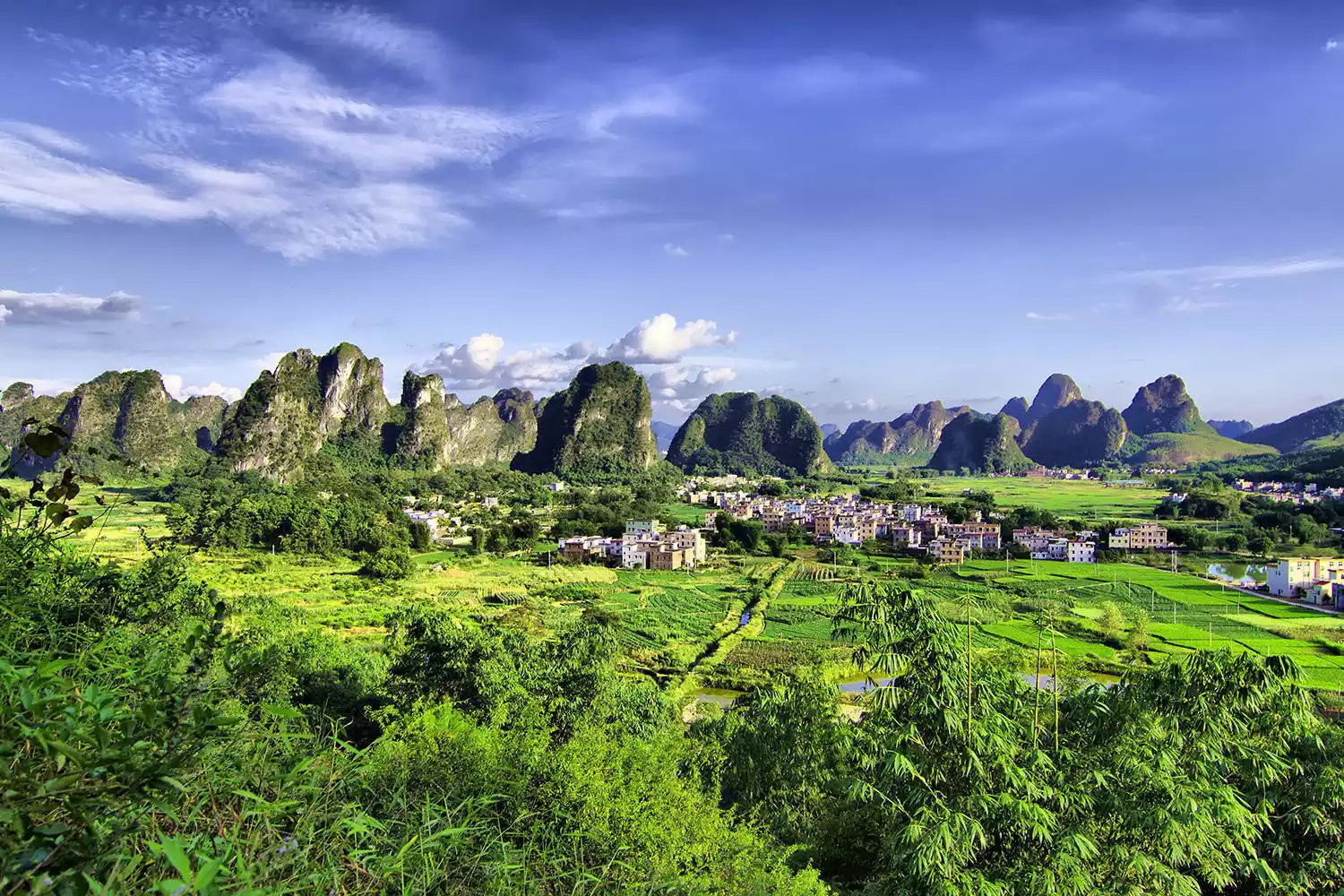 A valley surrounded by mountains, with thousands of limestone peaks densely distributed around it, streams, caves, and ancient buildings dotted in between. It stretches for more than 20 kilometers through the three towns of Jiulong, Mingjing and Yanbei. This beautiful landscape has been listed as one of the top ten most beautiful hiking routes in Guangdong.