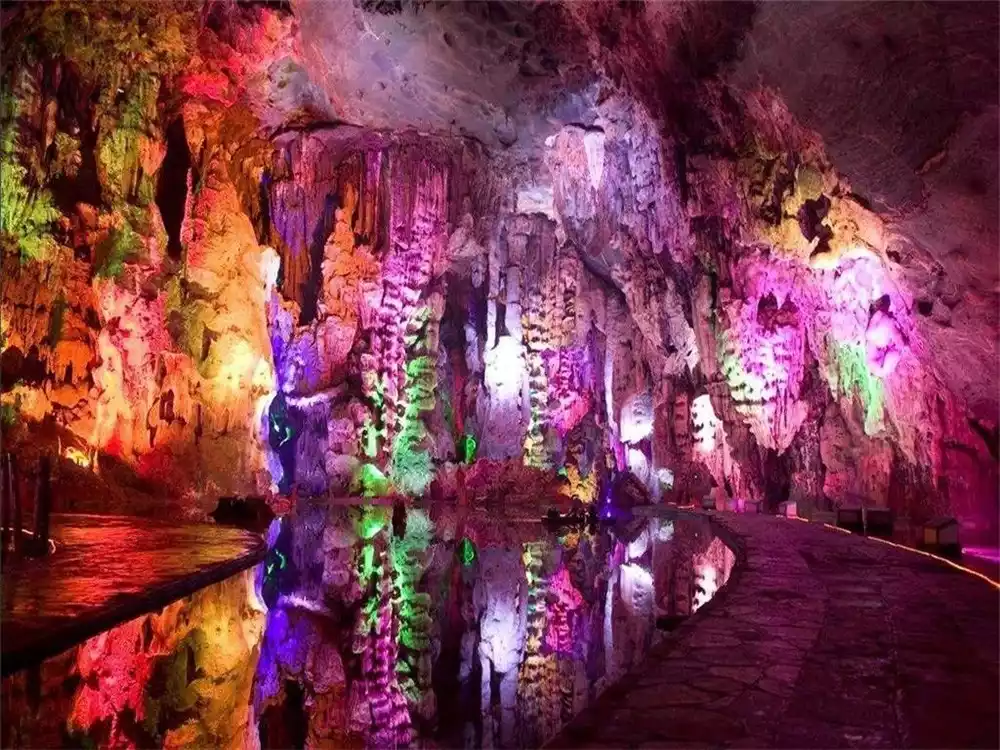 The cave was formed over 20,000 years ago. The scenery inside the cave is like the Guanghan Palace in the sky, with stalactites of various shapes and colors, beautiful and awe-inspiring.