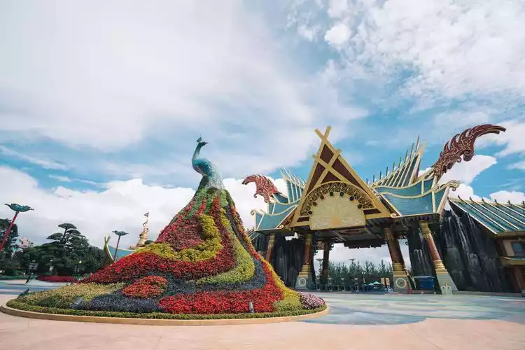 Colorful Yunnan Happy World is full of typical Yunnan elements, including proud and beautiful peacocks, adorable elephant dolls, and distinctive Yunnan-style ancient buildings. You can travel back to the prosperous era in just one second.