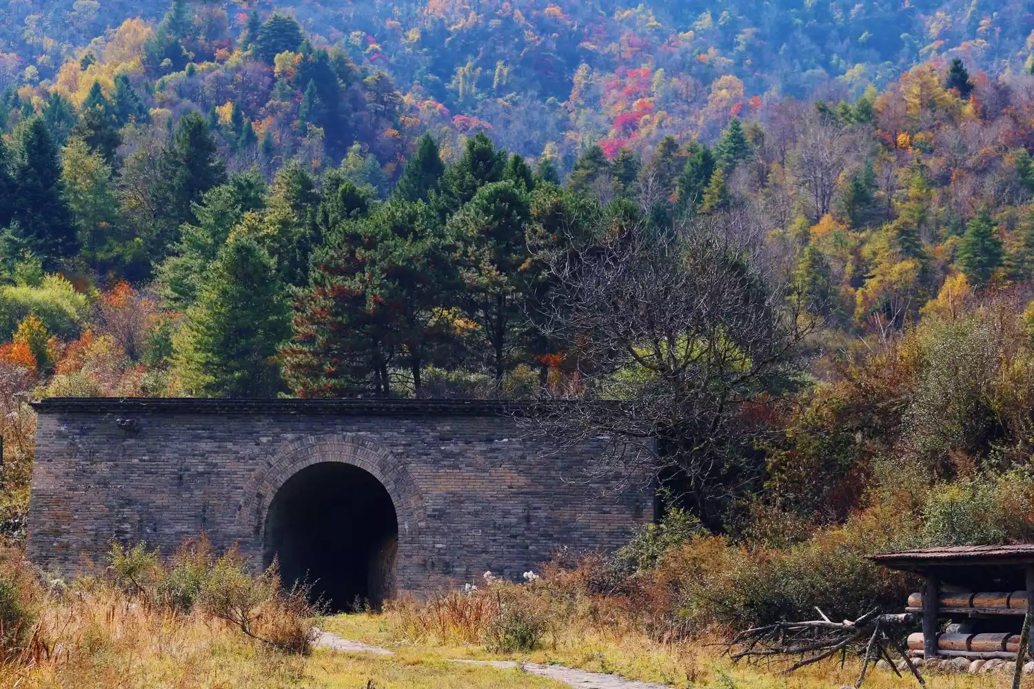 This is the most romantic scenery in Liuba in autumn. Hundreds of acres of larch have covered this place with a golden carpet, and the stream is gurgling through the canyon. Walking on the wooden avenue in the forest is like walking into a fairy tale world.