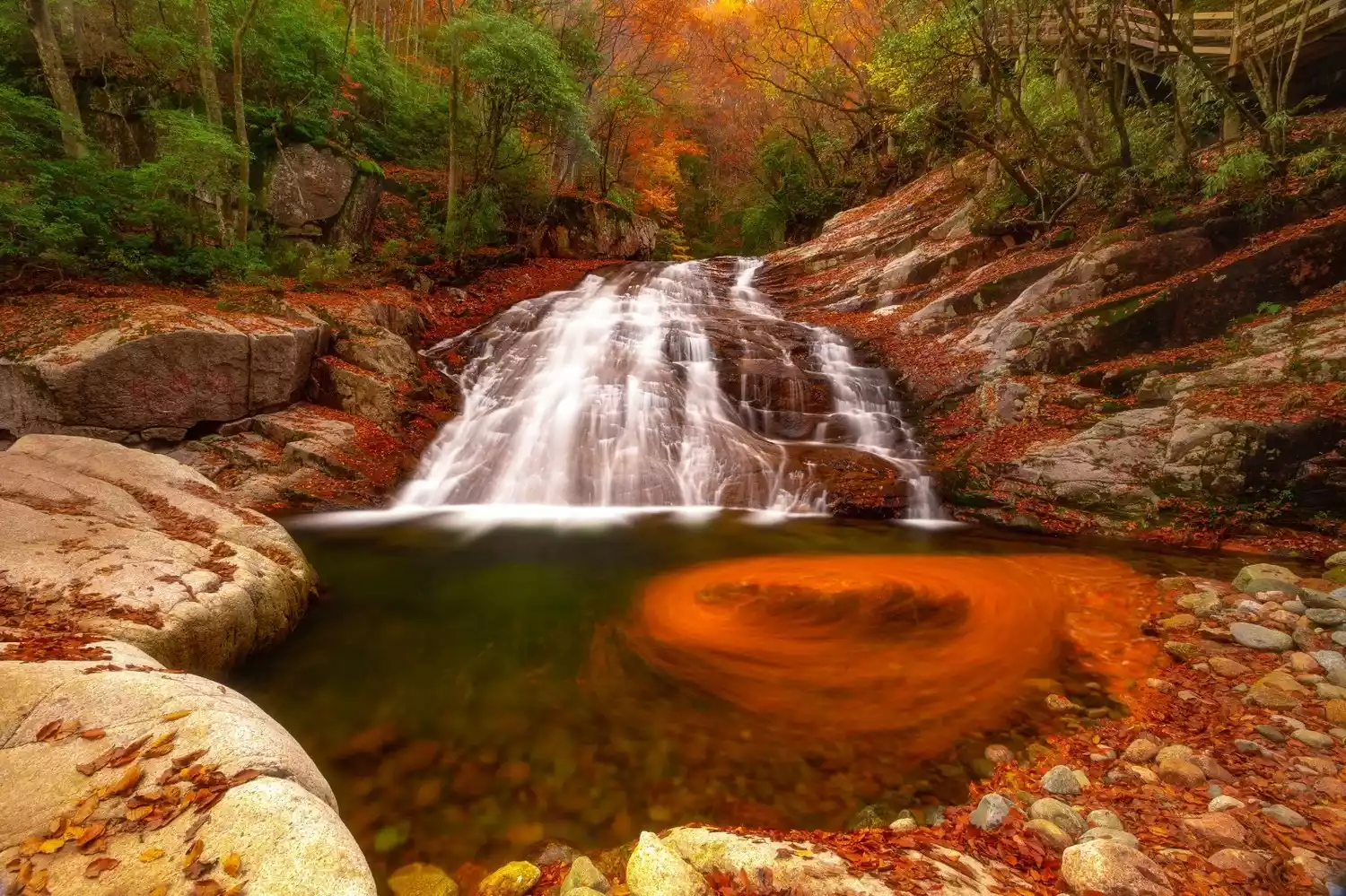 Eighteen Moon Lake is Guangwu Mountain's most beautiful waterscape. Red leaves drift down into the clear pool, swirling around in whirlpools before landing on the mountain path. Together with the vibrant red leaves and tranquil waterfall, the lake creates a unique and desolate autumn scene. The short 3-kilometer path is captivating, yet captivating, and captivating.