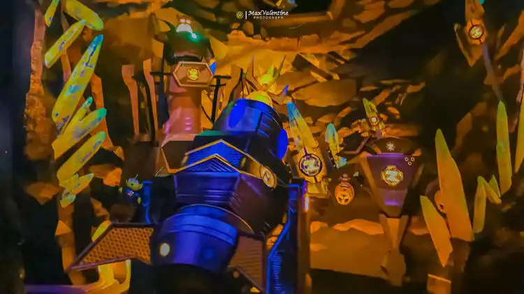 Tomorrowland, on the left side of the park, is a technologically advanced blue world, showcasing a blend of speed and passion. The motorcycle-shaped Nimbus shines beneath a dome of blue lights, undulating with the waves of the giant dome.
