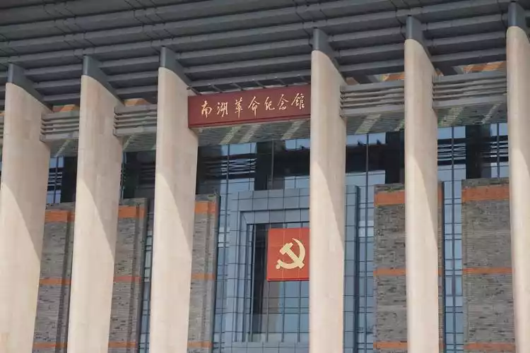 The main building of the memorial hall is a majestic "工"-shaped building with 56 eaves columns around it. On the high lintel are inlaid seven golden characters "Nanhu Revolutionary Memorial Hall" written by Mr. Xiaoping.