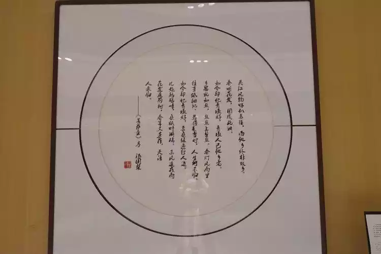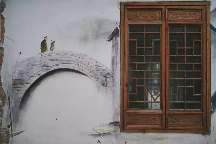 Walking out of the door on the other side of Wuzhen Hall, there are two works of art hanging on the wall.