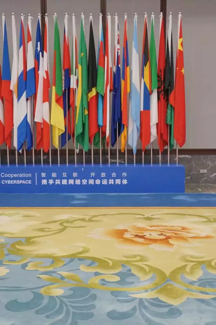 Directly in front of the prologue hall is the ink and color painting on paper "Clear Wind" painted by Wuzhen celebrity Mr. Mu Xin in 1999. National flags of various countries are neatly arranged under the frame, making it look particularly imposing.