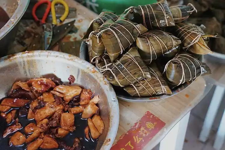 Meat dumplings are the most iconic of Jiaxing's zongzi, representing the local flavor. They're made by cutting large chunks of lean pork hind leg meat into large pieces and marinating them overnight in soy sauce, rice wine, and other ingredients. Once the meat is fully flavored, the sauce is poured out, mixed with glutinous rice, and then wrapped into dumplings. Once cooked, the steam from the pot, accompanied by the aroma of the meat dumplings, rises from the door, tempting hungry passersby.