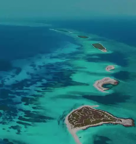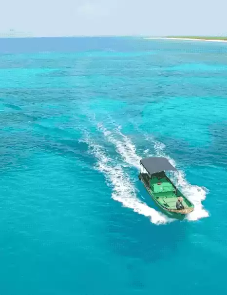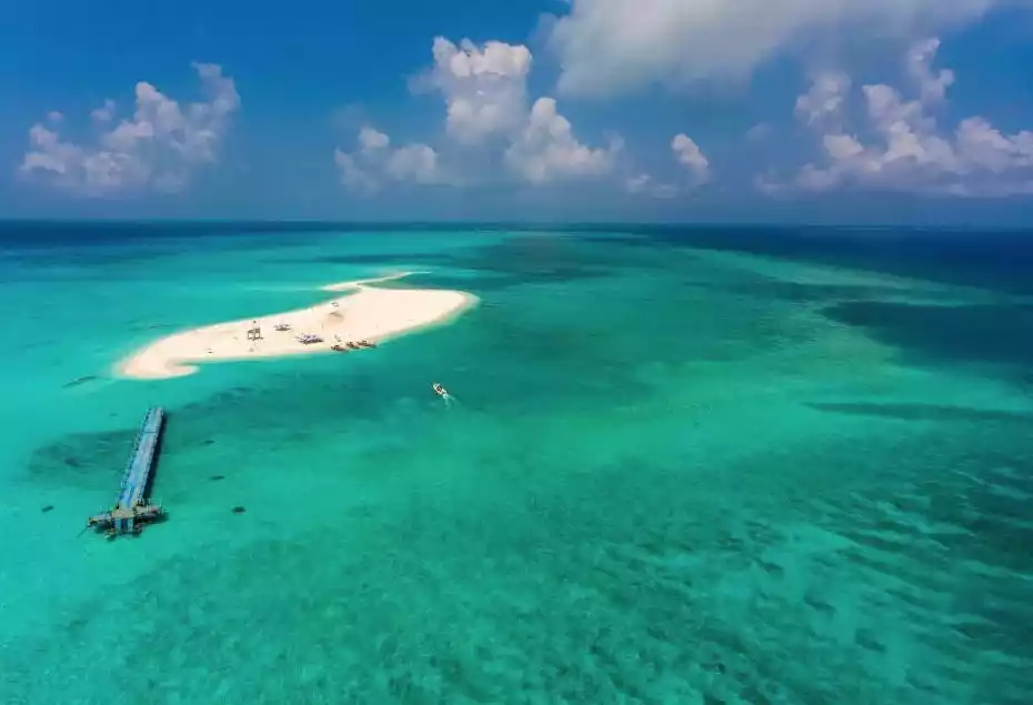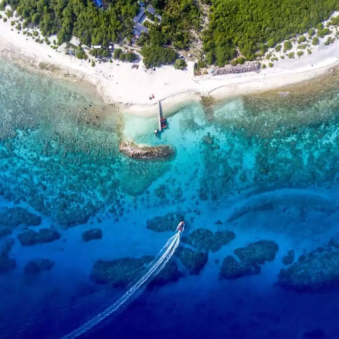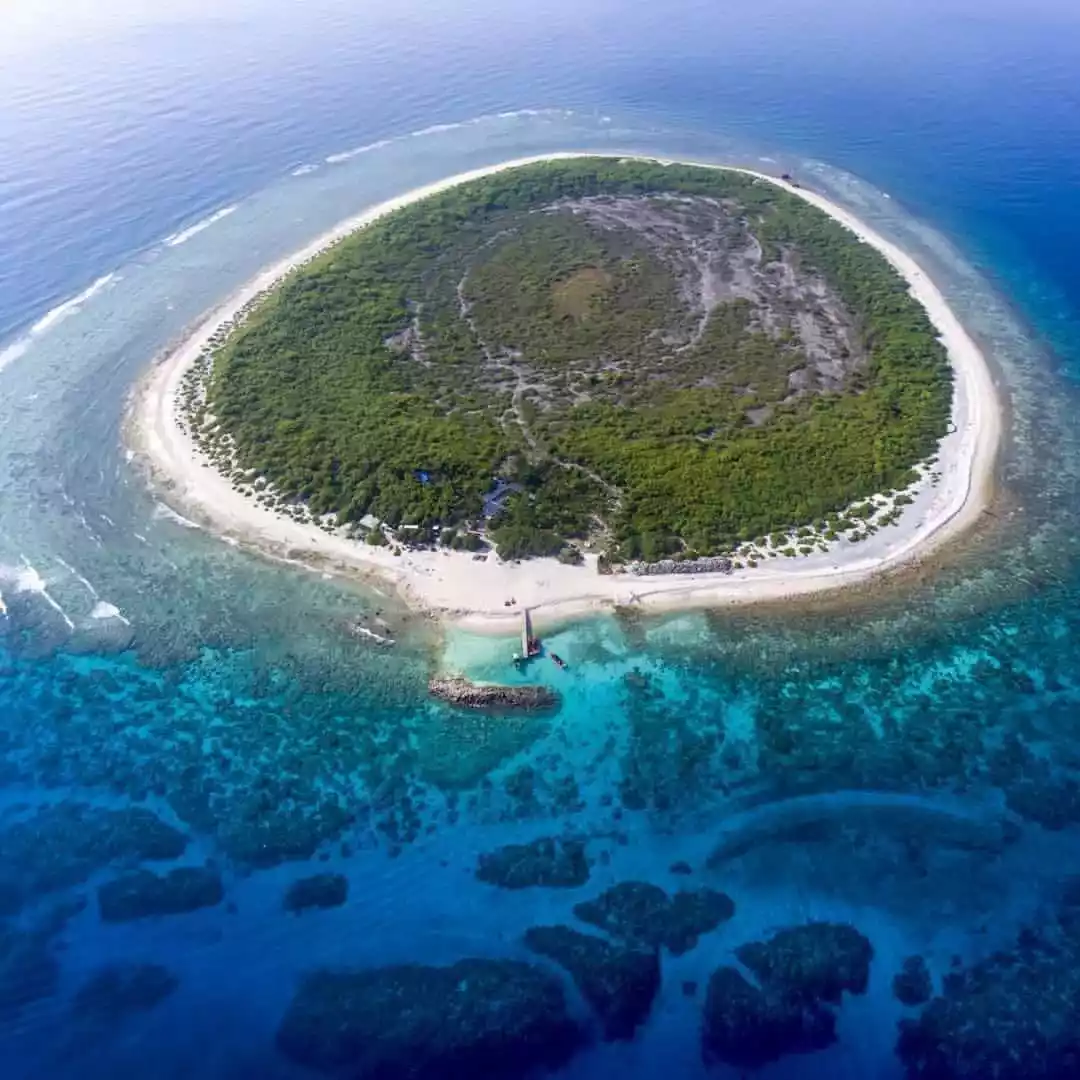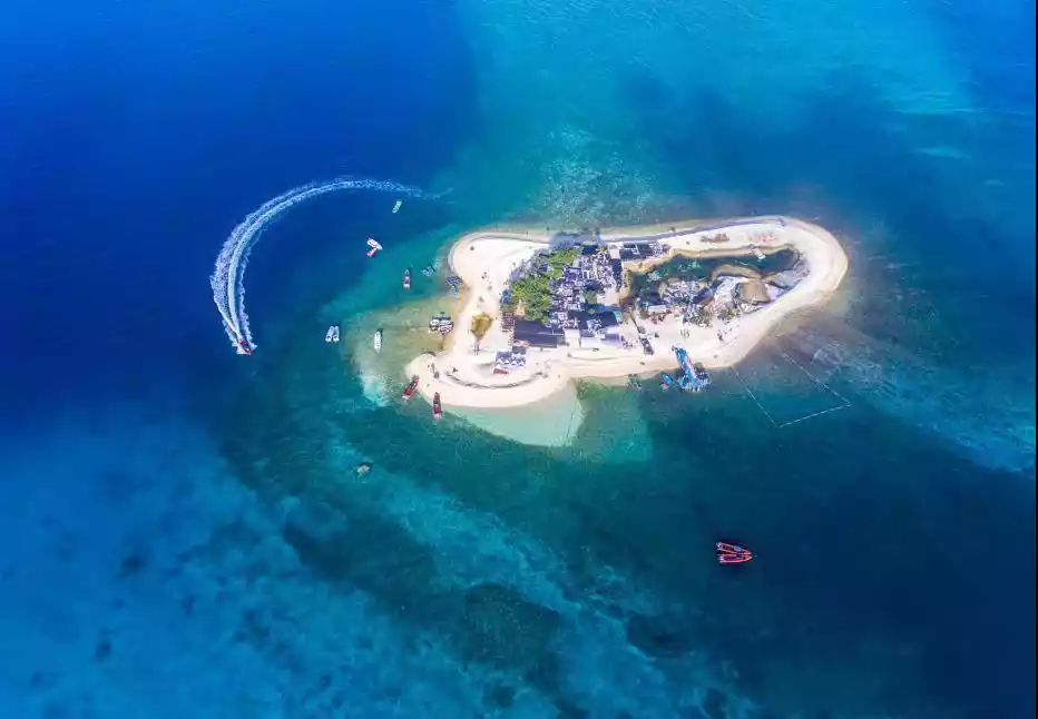 The island is covered in soft sand, and the surrounding water is so clear and transparent that you can see the seabed with your naked eye. Corals cover the entire seabed like blooming flowers, and fish swim freely among them...