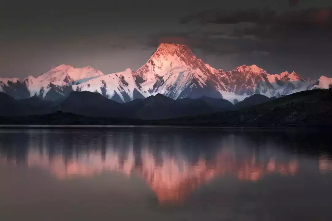Walk along the long gravel beach, go up to the Daguan Dejie Lake, and wait for a beautiful sunrise on the golden mountain; looking at Gongga from here, it is more like the perfect combination of Zimei Pass and Lengga Co. It is like a tear of Gongga, shining like a diamond under the snow-capped mountains, reflecting the most perfect and symmetrical reflection of Gongga.