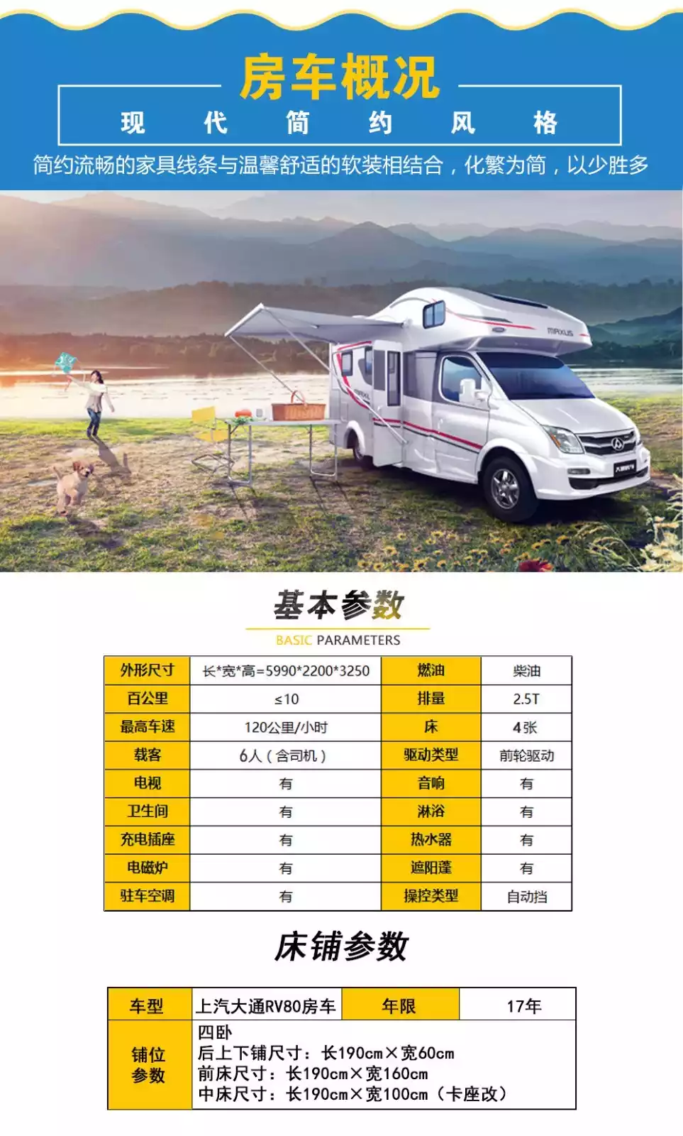 The accommodation facilities on the vehicle include: bedding, stove, lockers, dining table and chairs, refrigerator, air conditioner, induction cooker, TV, stereo, as well as toilet, shower and other facilities.