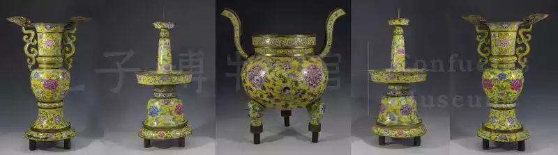 This set of porcelain was gifted by Emperor Yongzheng to the Confucius Mansion. It is bright yellow throughout, with ornate patterns and a majestic air. A closer look reveals the rich and captivating glaze. This set exudes an imperial elegance. The patterns on this Yongzheng porcelain set utilize at least 26 colors.