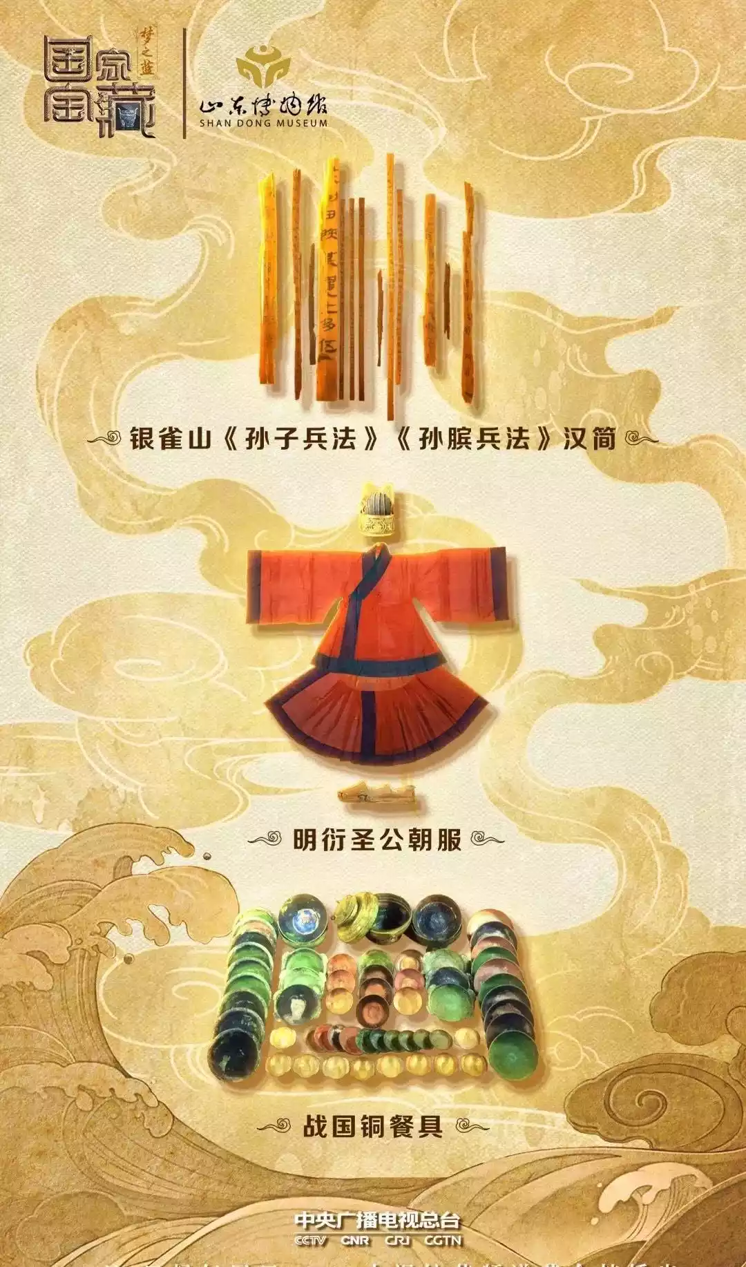 The Shandong Museum's three national treasures, selected for the National Treasures Collection, captivated the audience! The Yinqueshan bamboo slips containing Sun Tzu's and Sun Bin's "The Art of War," Warring States bronze tableware, and the Ming Dynasty court robes of the Duke of Yansheng, tell a thousand-year-old legend of the land of Qi and Lu.