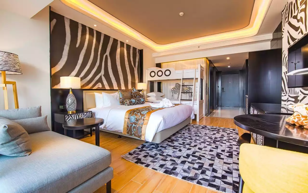 This family-friendly resort hotel features six animal-themed guest rooms, making them a favorite with children. The unique family-friendly rooms are also a favorite with many parents. Located next to Animal World, guests can enjoy watching wild animals roaming the park from the viewing balcony.