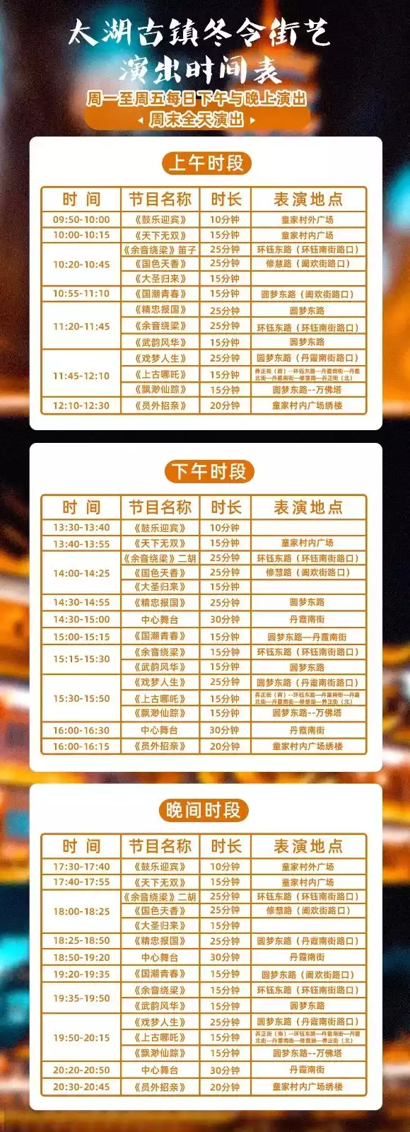Wander around Taihu Ancient Town, eat and drink, watch interactive street performances, and enjoy local snacks or a buffet at your hotel for dinner.