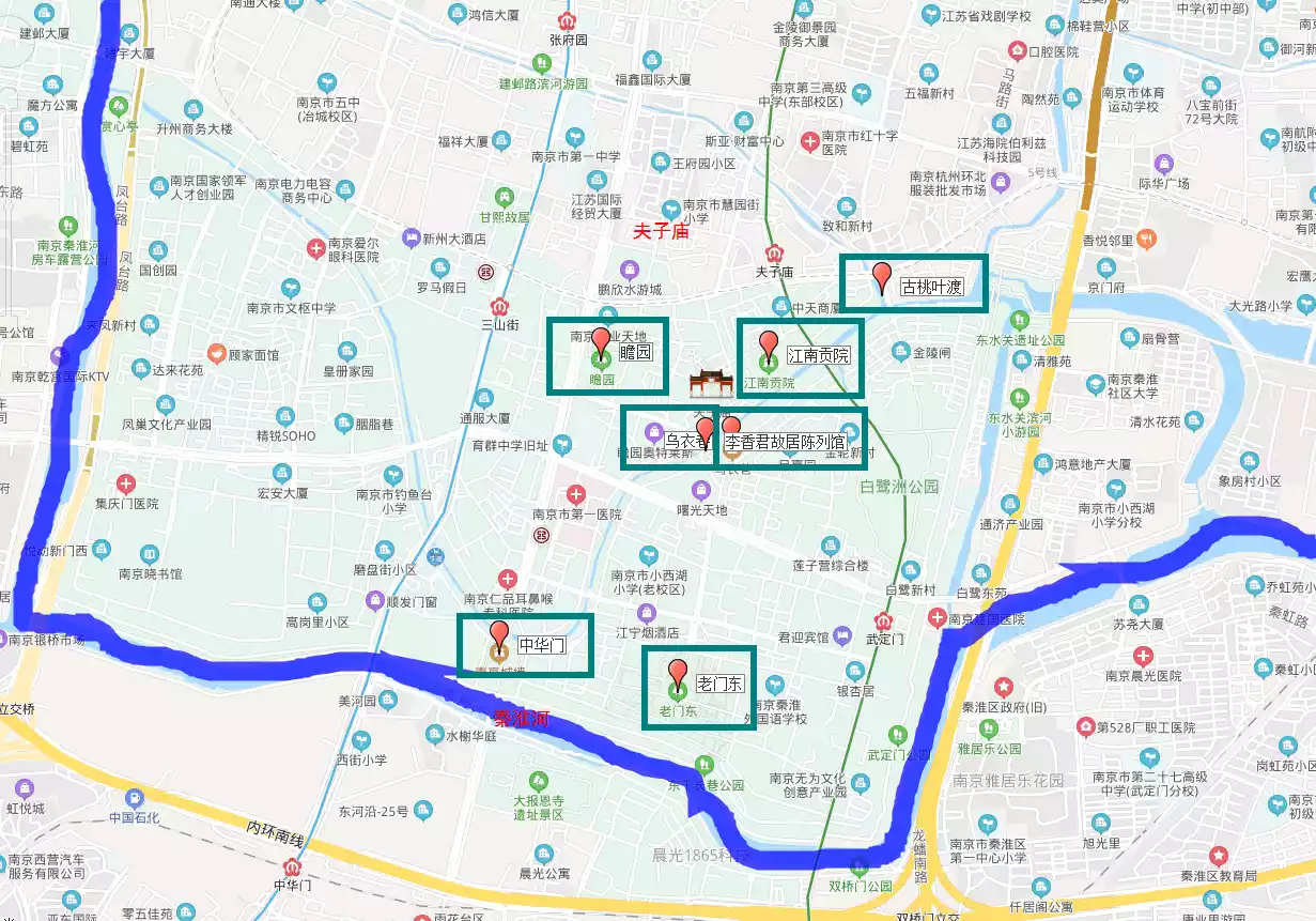 Confucius Temple, Zhanyuan Garden, Laomendong, Imperial Examination Museum (Jiangnan Gongyuan), and Zhonghua Gate.