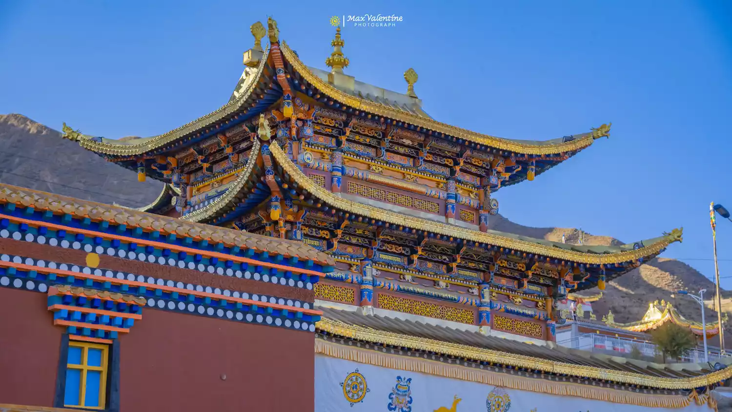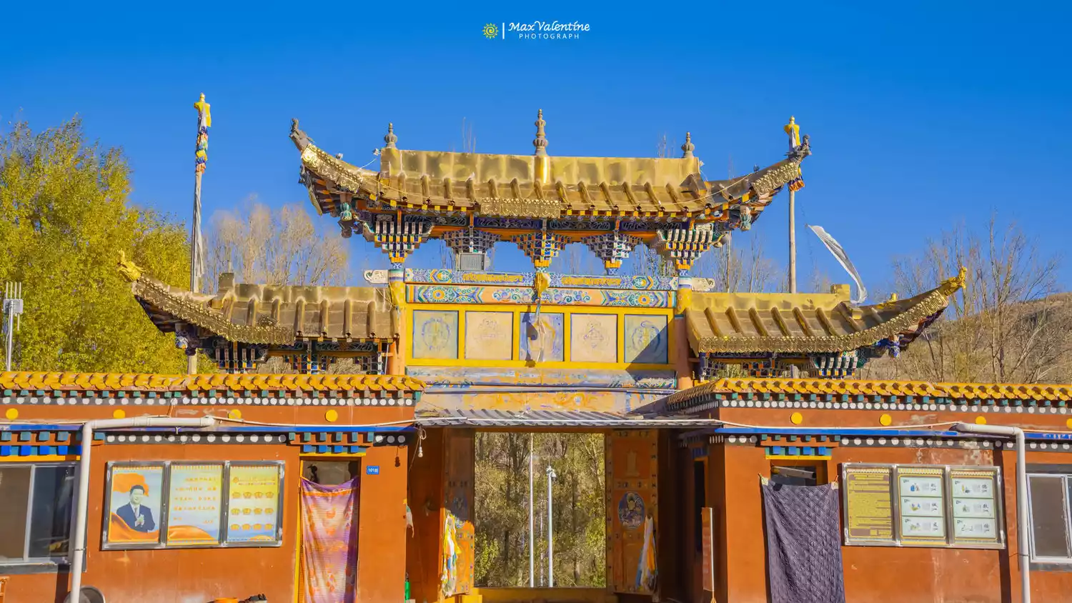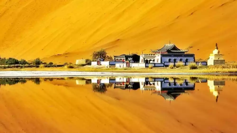 In the vast desert, this temple with white walls and golden roof stands against the sand hills and faces the lake, looking solemn and mysterious.