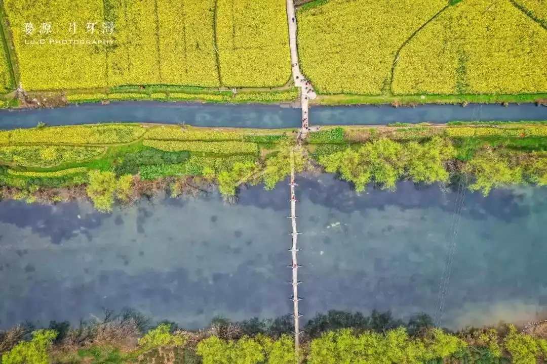 Unlike the magnificent terraced fields in Jiangling, the terrain here is relatively flat. There is also a small bench bridge here. Across the bridge is a quiet tea garden with dozens of peach trees. Whether you are shooting rape flowers and ancient villages across the bench bridge from the tea garden, or taking aerial photos, the photos are all very good.