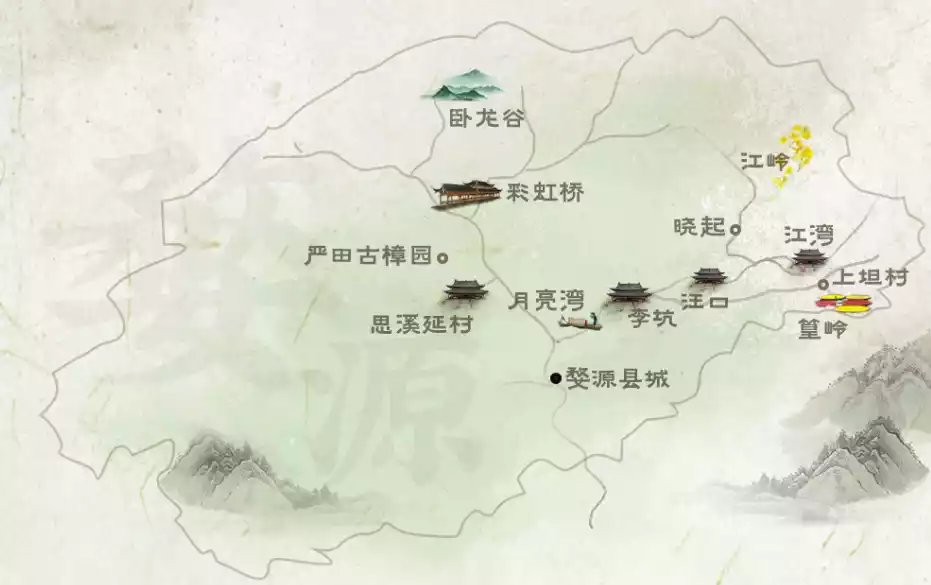 The east line is a traditional classic tourist route with a concentration of ancient buildings. It is also the place with the most beautiful and dense rapeseed flowers. The main attractions include: Likeng, Yueliangwan, Wangkou, Jiangwan, Xiaoqi, Jiangling, Huangling, and Qingyuan.