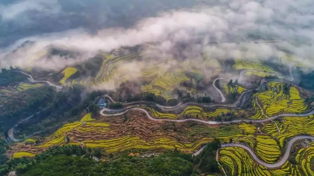 Rapeseed flowers are planted in terraced fields all over the mountains, stretching from the valley to the top of the mountain. Standing on the top of the mountain and looking down, the rapeseed flowers under your feet are stacked layer upon layer, stretching as far as the eye can see, full of vitality, and blowing in your face. There are several small villages surrounded in the middle, and the Hui-style houses with black tiles and white walls are interspersed in the golden area, like a natural painting.