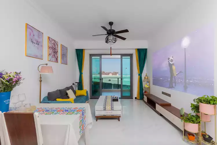 The living room is designed in a fresh and simple style, with soft sofas in Morandi colors, a French retro dining table, an exquisite and elegant ceiling fan, and a large projector, creating a comfortable and cozy private space.