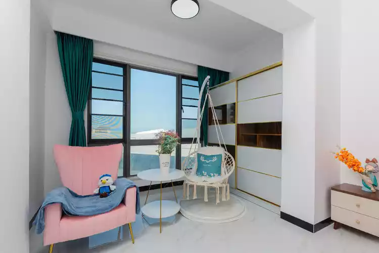 It is worth mentioning that the balcony is equipped with a popular leisure hanging chair. The comfortable color combination adds a touch of softness. It is also an excellent viewing platform. When you open the curtains, you can see the blue sea and blue sky. It is very suitable for taking a nap and chatting.
