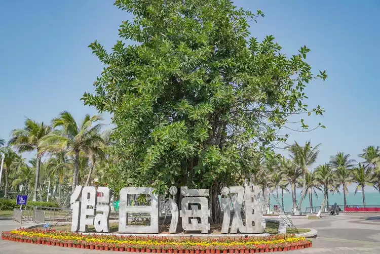 At the entrance of the scenic area, the four words "Holiday Beach" come into view, hidden among lush green plants, with the sparkling sea behind and swaying coconut trees around, creating a unique charm.