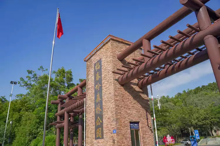 The entrance gate is uniquely designed. The words "Linchunling Forest Park" are clearly visible on the stone wall, with gold characters on a black background, showcasing the park's rich cultural heritage. The wooden sculpture on one side is also eye-catching, complementing the surrounding trees, creating a fresh and rustic atmosphere.