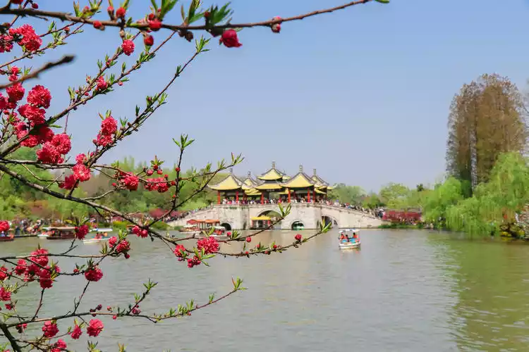 Slender West Lake, sometimes wide and sometimes narrow, is lined with lush trees and boasts ancient and diverse gardens. If you haven't visited Slender West Lake, you haven't been to Yangzhou. Its gardens are among the most magnificent in the world. And in spring, Slender West Lake is awash with flowers, each vying for splendor. Embrace the spring breeze, follow the fragrance of the blossoms, and enjoy the springtime.