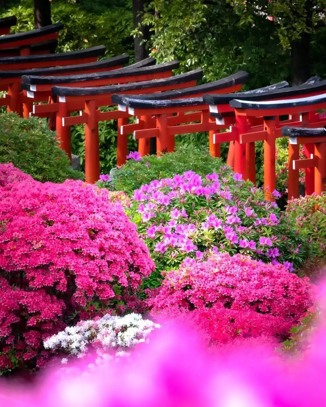 There is also the 1900-year-old Nezu Shrine in Bunkyo Ward, Tokyo. Every April, more than 3,000 azaleas bloom together, and the torii gates and the azaleas are really beautiful!