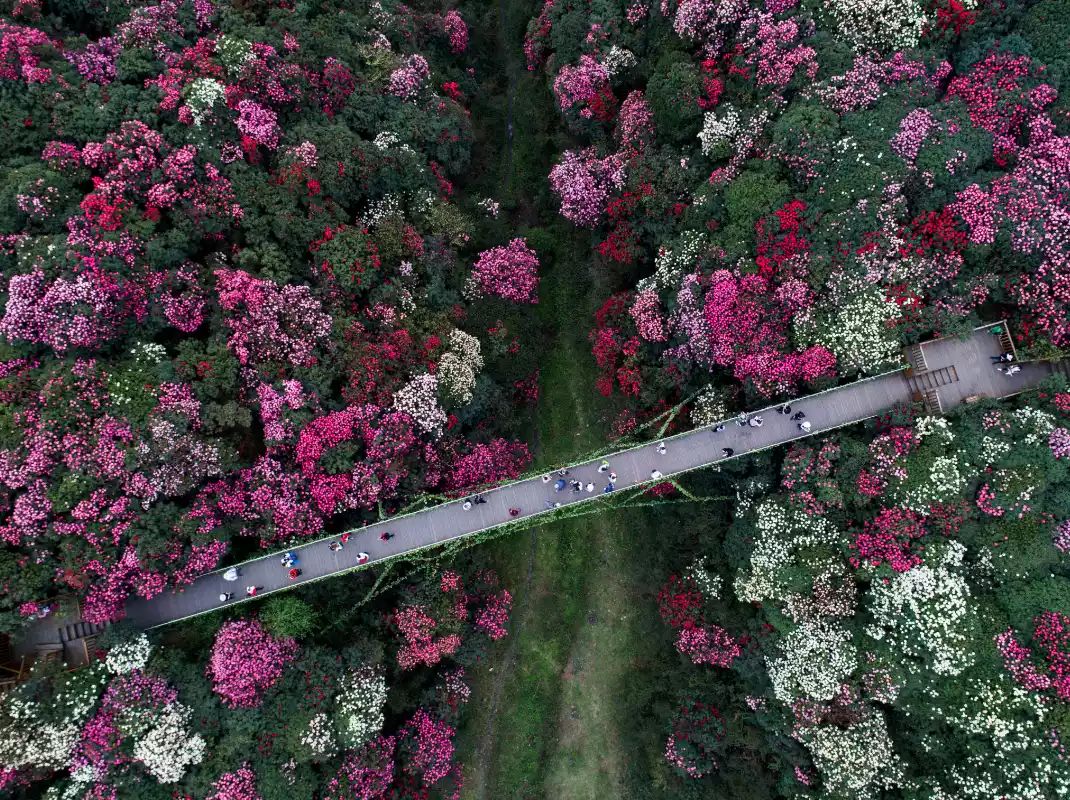 Baili Rhododendron Scenic Area is home to many ethnic groups including Yi, Buyi, Gelao, etc. During the blooming season, young people from nearby areas go to the flowers to sing songs. There are crape myrtles, dahlias, moss pinks, roses, glass suspension bridges, plant mazes, and glass plank roads. There are flowers every month and in bloom all year round.