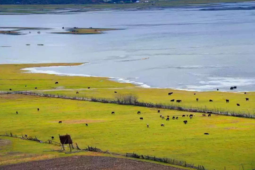 From late autumn to summer and autumn of the following year, the lake water level drops and this place will gradually turn into wetlands and grasslands, becoming a paradise for animals such as black-necked cranes, bar-headed geese, and white cranes. They will forage and play in the swamps by the lake, and many bird watchers and photography enthusiasts will come here at this time.