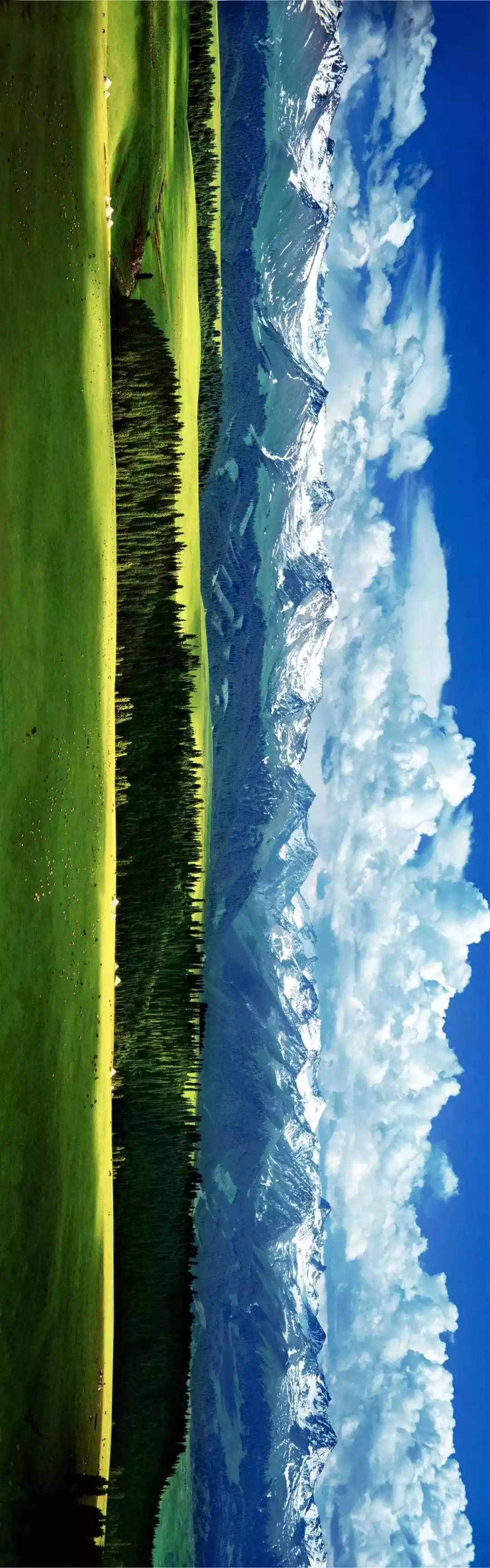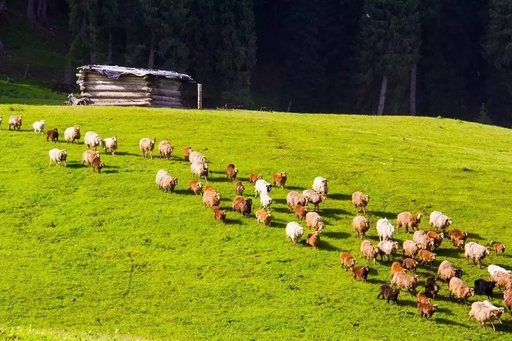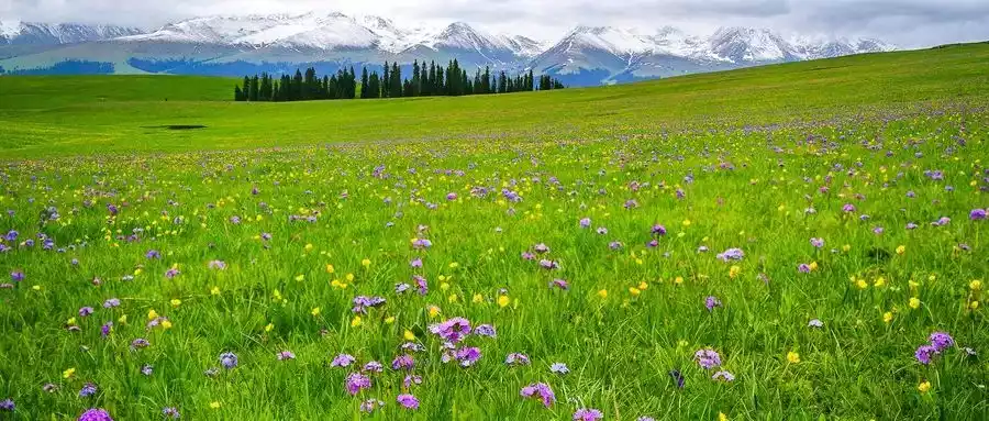 The Kalajun Mountains stretch east-west, flanked by ravines and undulating plains dotted with lush, primeval spruce forests. The summit of Kalajun, however, forms a seamless, south-sloping plateau, covered in lush grass and vibrant flowers, like an unfurling green carpet that stretches all the way to the foot of the snow-capped mountains.