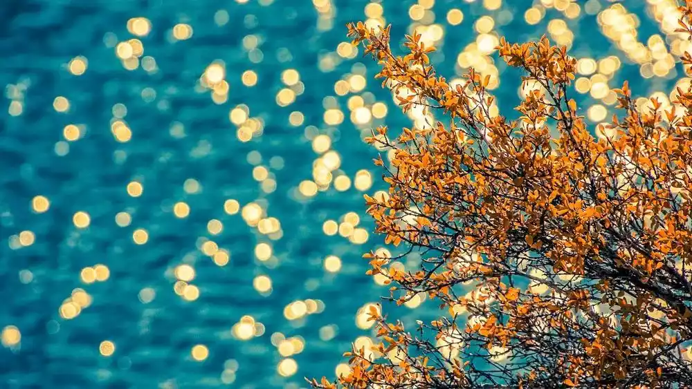 The lake, bathed in sunlight, shimmers in a dazzling array of colors, its shimmering ripples irresistibly captivating.