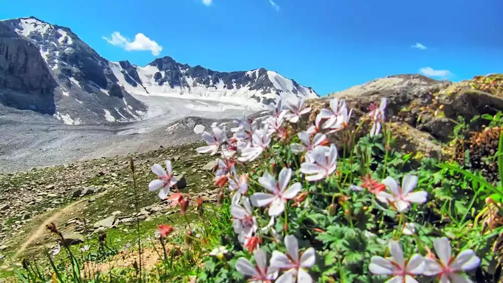 ▲Tianshan Snow Lotus and Bogda Peak. The flowers with white petals and green leaves are Tianshan Snow Lotus. Local regulations in Xinjiang prohibit picking snow lotus.