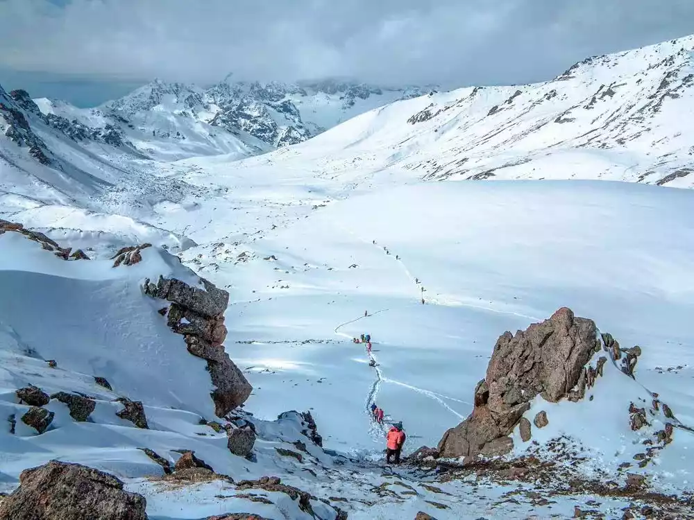 The highest point, Akebulak Pass, is 3,900 meters above sea level, and some sections of the trail slope over 60 degrees. Don't look back as you ascend, or your legs will give out.