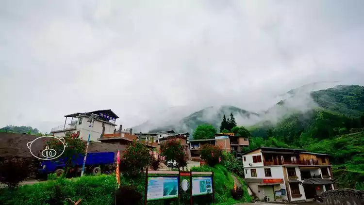 The village is clean and tidy, with several houses under construction. Behind the village are terraced fields, and the walking path up the mountain is easy to follow, with a wooden plank road leading up.