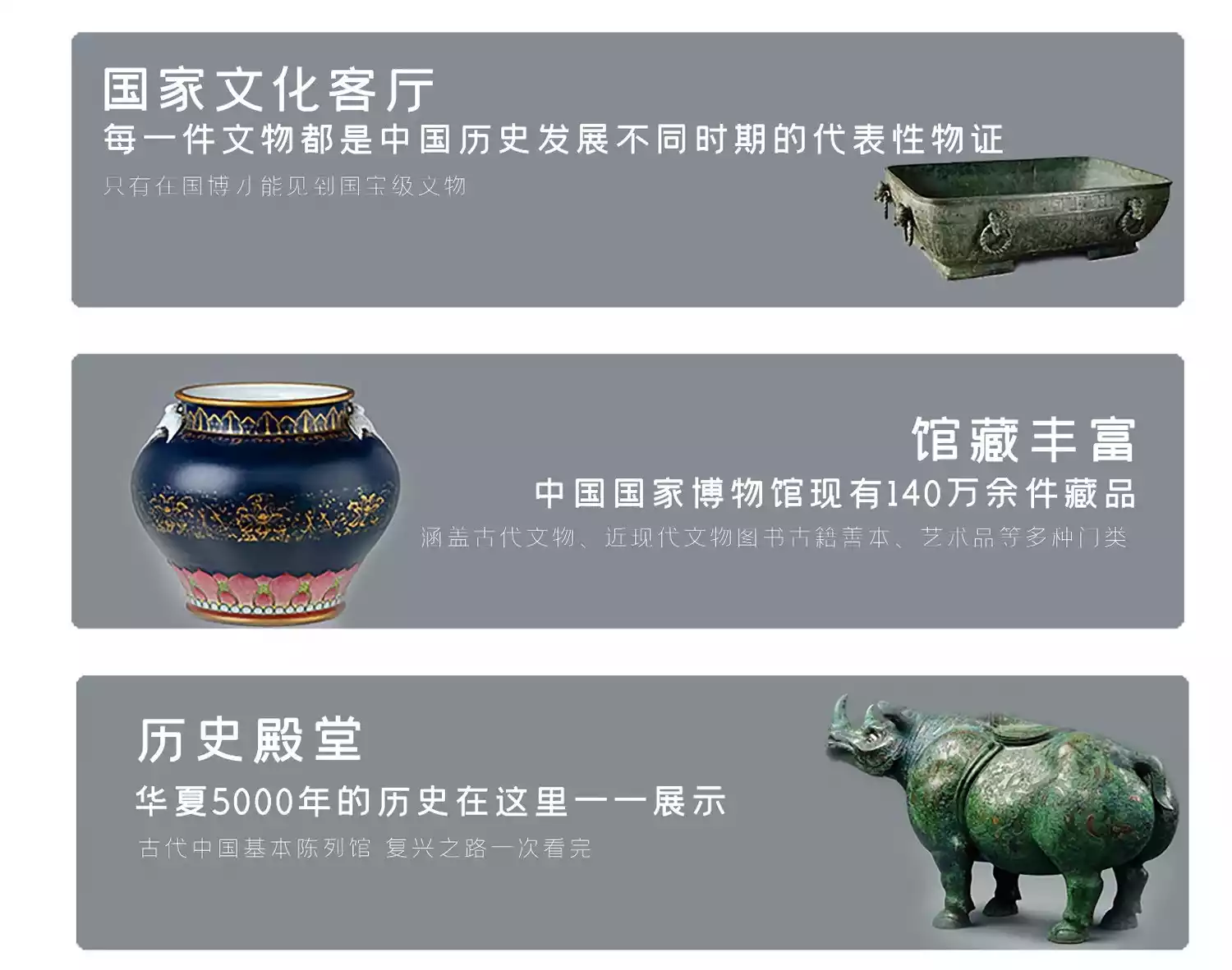 The basic exhibition of ancient China connects eight historical periods, from ancient times - Xia, Shang and Western Zhou - Spring and Autumn Period and Warring States Period - Qin and Han - Three Kingdoms, Jin and Southern and Northern Dynasties - Sui, Tang and Five Dynasties - Liao, Song, Xia, Yuan and Jin - Yuan, Ming and Qing Dynasties.