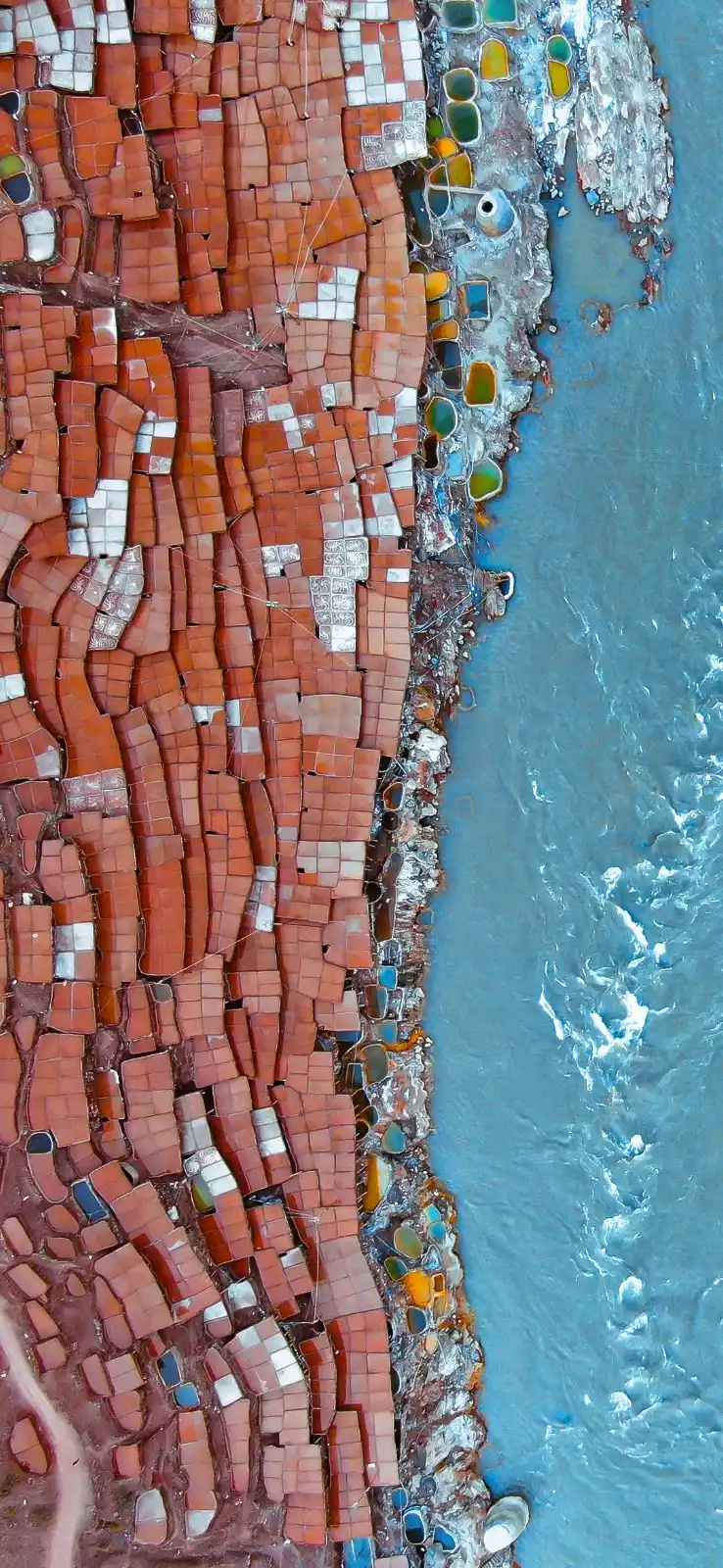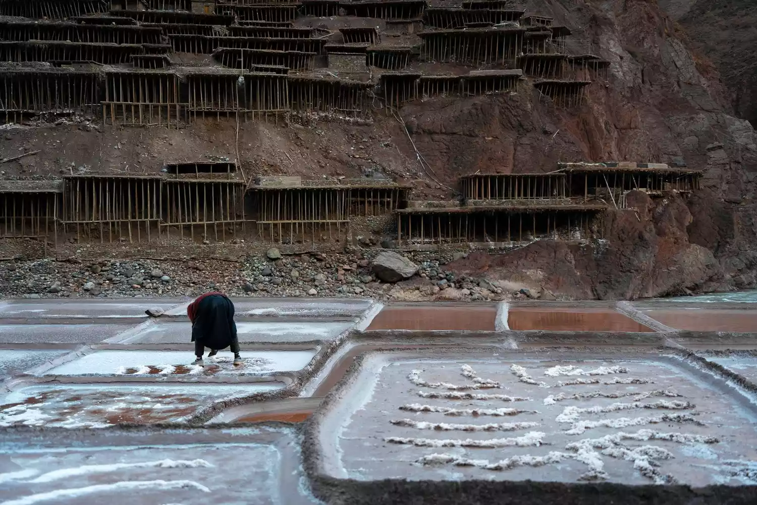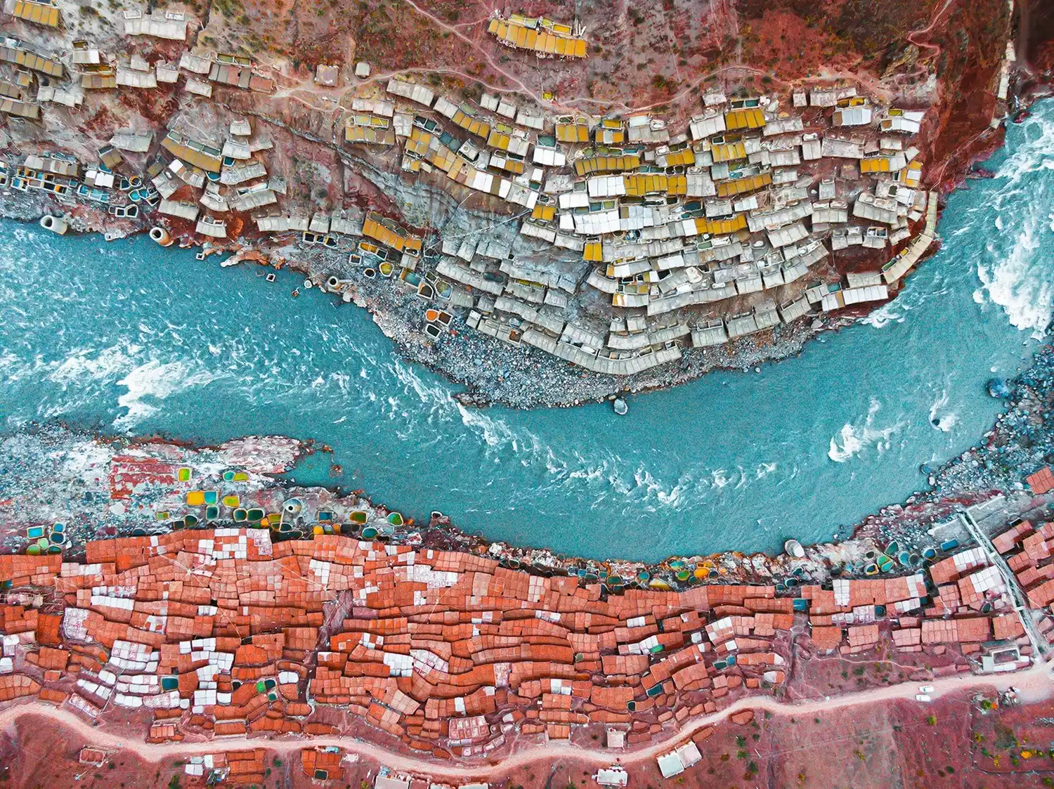 The salt fields built layer by layer on the mountain are majestic. The processed salt is red and white. Taken from overhead drone photos, it looks like a palette of warm colors. The salt farmers follow the footsteps of their ancestors, working hard on the rugged and dangerous trails, continuing their lives while also creating a unique landscape in the world.
