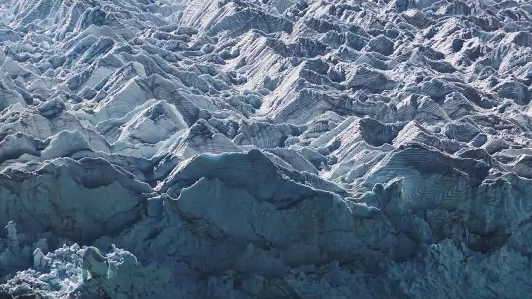 Using an aerial camera to overlook the Rongrong Glacier, the surface of the glacier at an altitude of about 4,800 meters can clearly see the huge ice cracks on the surface.